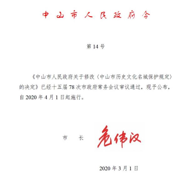 政策发布丨中山市人民政府关于修改《中山市历史文化名城保护规定》的决定
