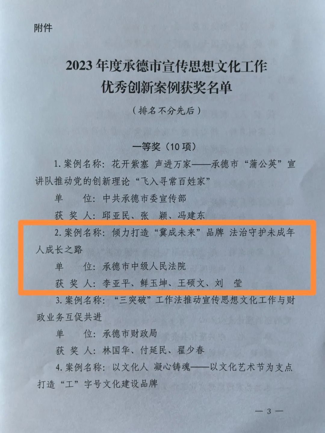 近日,中共承德市委宣传部印发了《关于表彰2023年度全市宣传思想文化工作优秀创新案例的通报》,其中市法院报送的创新案例《倾力打造“冀承未来”品牌 法治守护未成年人成长之路》被评为一等奖。