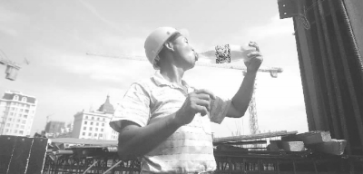 图为7月12日,在银川市某建筑工地上,一位工人在烈日下饮水。(彭昭之摄)