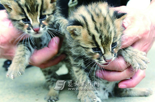 州野生动植物保护管理站林业工程师刘强在现场仔细查看后,确认这种动物为“豹猫”,系省级重点保护动物。经过现场测量,这两只小豹猫目前只有23厘米长,高10厘米,重8两,刚出生10天左右。刘强说,以前州内的建始、巴东曾有过发现类似豹猫动物的报告,但发现活体尚属首次。