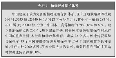 中国持续加大迁地保护力度,系统实施濒危物种拯救工程,生物遗传资源的收集保存水平显著提高,迁地保护体系日趋完善,成为就地保护的有效补充,多种濒危野生动植物得到保护和恢复。
