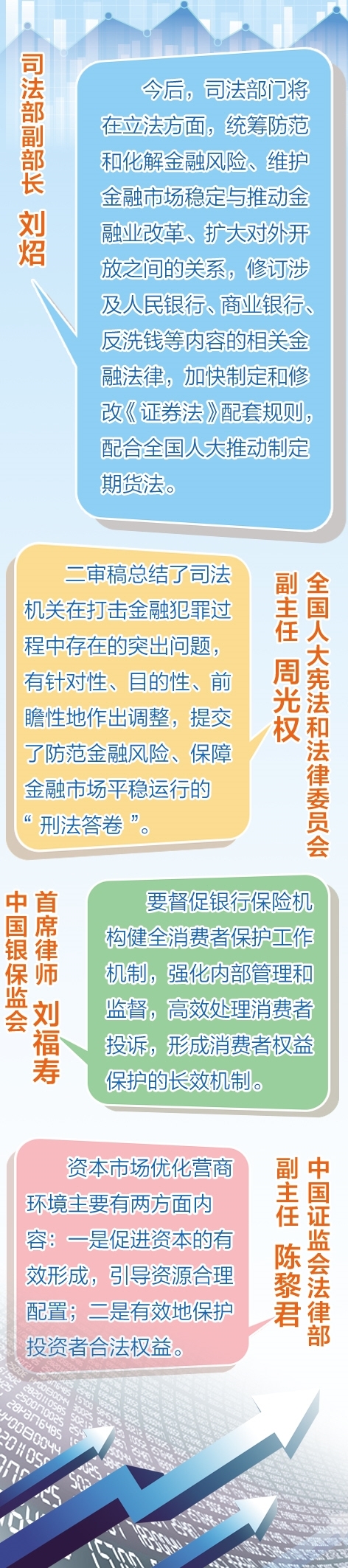 刘炤表示,当前我国金融市场正处于进一步深化改革和扩大对外开放的关键阶段,作为规则导向型的市场,金融市场对法治化营商环境有着较高的需求度和依赖性。今后,司法部门将在立法方面,统筹防范和化解金融风险、维护金融市场稳定与推动金融业改革、扩大对外开放之间的关系,修订涉及人民银行、商业银行、反洗钱等内容的相关金融法律,加快制定和修改《证券法》配套规则,配合全国人大推动制定期货法。在法律服务方面,司法部将继续推动建立各类调解对接工作机制,加强人民调解与行政调解、司法调解的衔接联动,通过组织法律法务团,开展专项法律服务活动,健全企业法律顾问、公司律师制度机制等措施。