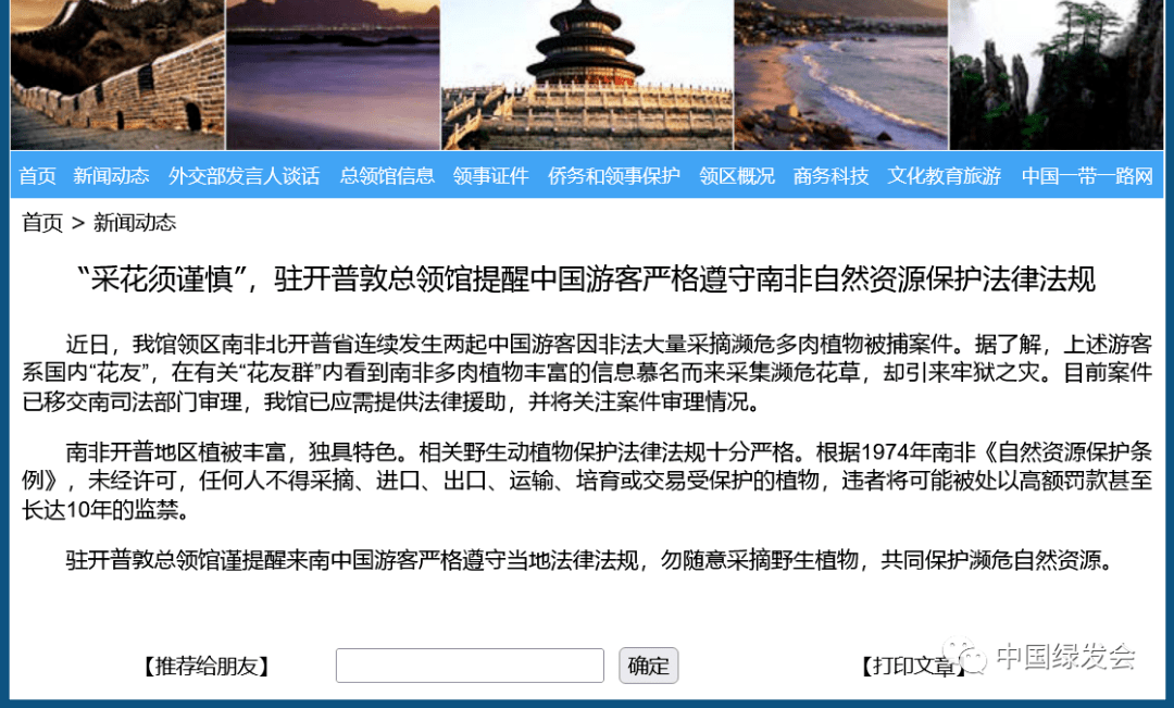 “近日,我馆领区南非北开普省连续发生两起中国游客因非法大量采摘濒危多肉植物被捕案件。据了解,上述游客系国内“花友”,在有关“花友群”内看到南非多肉植物丰富的信息慕名而来采集濒危花草,却引来牢狱之灾。目前案件已移交南司法部门审理,我馆已应需提供法律援助,并将关注案件审理情况。