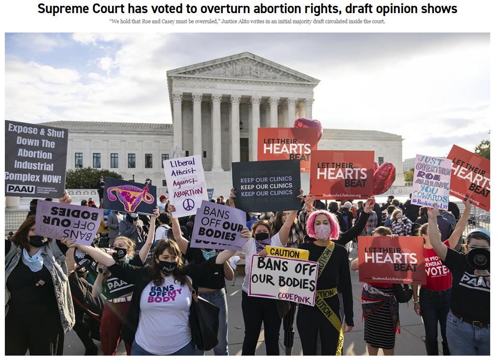 本周一晚,Politico曝光了最高法院一份泄密的多数意见草案:高院将借对密西西比州多布斯诉杰克逊案(Dobbs v. Jackson)的判决,推翻具有划时代意义的罗伊诉韦德案(Roe v. Wade)。
