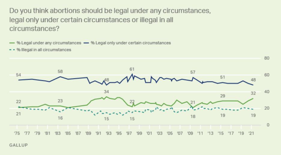 上图为盖洛普与堕胎相关的民意调查结果,绿线代表无条件支持堕胎的人数比例,深蓝实线代表有条件支持堕胎的人数比例,浅蓝虚线代表绝对不支持堕胎的人数比例。