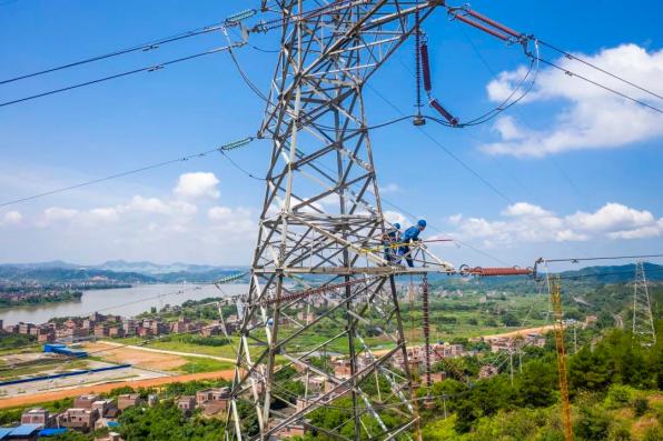 电力工人在高压线路上进行安全检修维护