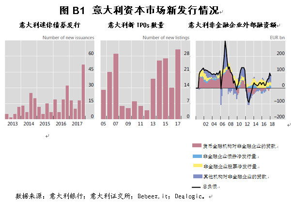 迄今为止,上述四项举措的成果令人鼓舞,资本市场在外源融资中发挥了更大的作用。自2012年实施新措施以来,意大利迷你债券的年新发行量稳定增长(图B.1,左图),首次公开发行股票(IPOs)数量呈上升趋势,上市企业数量达到2005年以来的最高水平(图B.1,中图)。