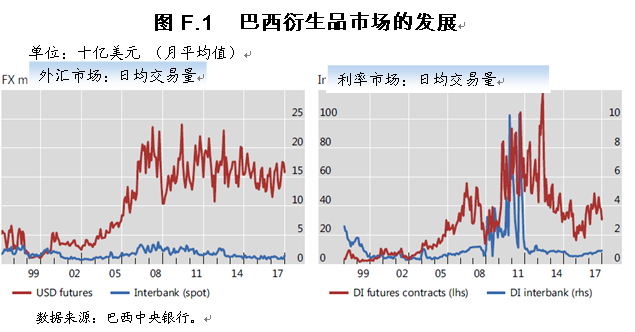 自21世纪初以来,巴西外汇和利率衍生品市场都出现了强劲增长,发挥了汇率和利率市场价格发现的功能。近年来,美元衍生品市场的交易量平均是外汇现货市场交易量的14倍(图F.1,左图)。值得注意的是,对外币使用和交易的限制促进了用衍生工具代替现货交易的行为。近期研究表明,巴西汇率是由美元期货而非外汇现货市场决定的(Garcia等,2014)。在同一时期,利率期货呈明显上升趋势(图F.1,右图)。近年来,单日银行间存款利率(DI)衍生品市场交易量约为DI银行间市场交易量的30倍。单日DI期货收益率曲线已成为巴西固定收益工具的基准收益率曲线。