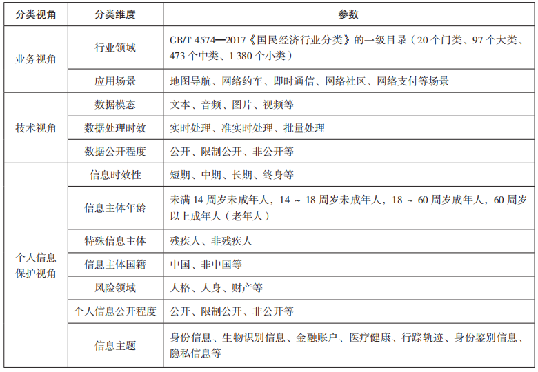 敏感个人信息的数据分类视角可分解为业务视角、技术视角、个人信息保护视角。对分类视角进行进一步拆分,梳理出以下几个分类维度。
