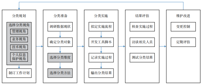 敏感个人信息数据分类研究需要为敏感个人信息科学分类提供可行的思路,既能满足管理部门对敏感个人信息的管理需求,又能避免基于传统的分类方法导致的分类结果缺乏可解释性以及演进能力低的问题。敏感个人信息的数据分类过程可以分为 5 个步骤,依次为分类规划、分类准备、分类实施、结果评估、维护改进,如图 1 所示。