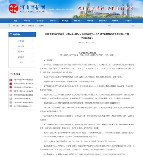 记者了解到,《河南省网络安全条例》是继《湖南省网络安全和信息化条例》之后我国第二部网络安全地方性法规。目前,我国已经建立了包括《中华人民共和国网络安全法》《中华人民共和国数据安全法》《中华人民共和国个人信息保护法》等重要法律和《网络安全审查办法》《云计算服务安全评估办法》等部门规章和规范性文件,网络安全防线不断筑牢,互联网在法治轨道上行稳致远。