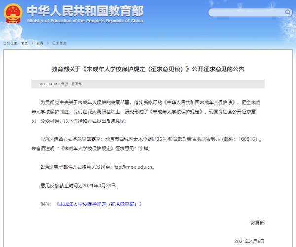 央广网北京4月8日消息(记者李欣)据中央广播电视总台中国之声《新闻纵横》报道,今年6月1日,新修订的《中华人民共和国未成年人保护法》就要正式开始施行了,距离这个日子满打满算还有不到2个月的时间。如何健全未成年人学校保护制度,为“少年的你”撑好法律“保护伞”也成为了近年来热度很高的话题之一。近日,教育部公布了《未成年人学校保护规定(征求意见稿)》(简称“征求意见稿”),并面向社会公开征求意见。征求意见稿发出后引起了社会广泛关注和讨论。