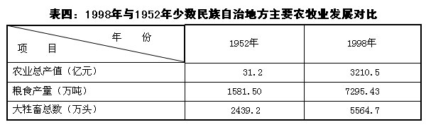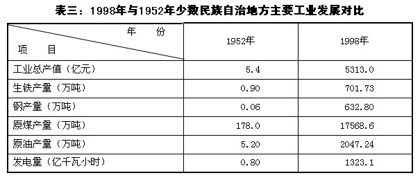 国家对少数民族地区的基础设施建设和基础产业发展十分关注,近年来优先在少数民族较为集中的中西部地区安排水利、电力、交通、环境保护和资源开发项目,并实行投资倾斜,引导外资更多地投向中西部地区。1998年,国家增加的财政投资用于中西部地区的占62%,中央财政用于中西部地区固定资产投资增长31.2%,高出东部地区14.9个百分点,创新中国成立以来最高水平。这些政策和措施有力地促进了少数民族地区的经济发展(见表三)。据统计,1998年少数民族自治地方铁路营业里程达1.73万公里,是1952年的4.6倍;公路通车里程达37.41万公里,是1952年的14.4倍;邮路及农村投递总长度113.54万公里,是1952年的8.6倍。