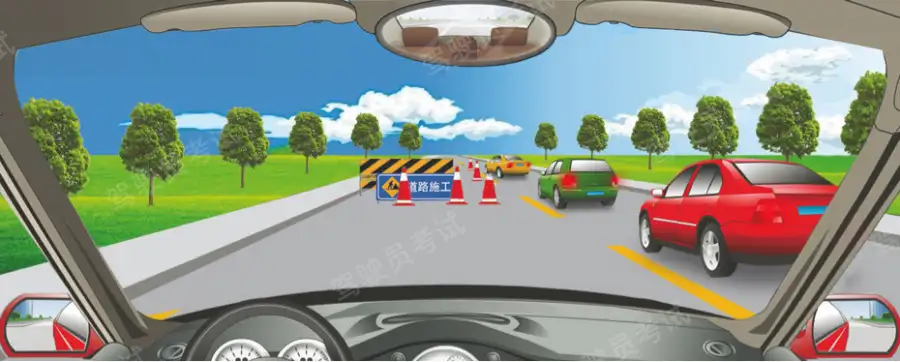 行车中发现前方道路拥堵时,应怎样做?A、寻找机会超越前车B、从车辆空间穿插通过C、减速停车,依次排队等候D、鸣喇叭催促