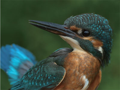 翠鸟又叫翡翠,大约有90种,大部分以捉鱼为生,分布在世界各地,但主要集中在热带地区。它们型体小,脑袋大,足短而鲜红,喙长而厚实。虽然翠鸟的体形只有麻雀般大小,但尖利的喙却几乎占了它体长的一半。当然,这与它的捕猎风格是相一致的,也是漫长岁月中进化适应的结果。有趣的是,判定翠鸟的性别也可以通过它这尖似利剑般的喙:雄鸟的喙通体都是黑色的,雌鸟喙的下半部分是红色的。翠鸟的翠羽鲜艳亮丽,由于折光的缘故,闪闪发光。过去的帝王服装和“凤冠”,用翠鸟的翠羽作为装饰,经历漫长岁月也不褪色。
