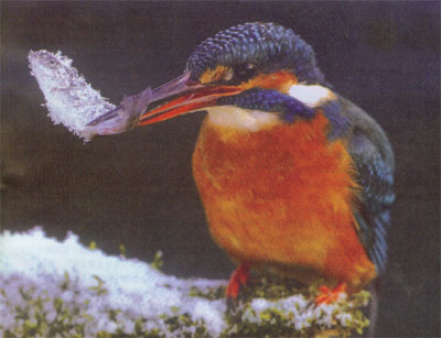在经历第一个严重的冰冻期后,很多小溪和池塘都在短时间里结了冰,而有泉眼的小池塘,仍会有几米见方的水域不被冻结。这时,聪明的翠鸟就把家安在这片不冻水域的旁边。几乎每一天。翠鸟都会多次俯冲入冰冷的水中,有时多达上百次。即使在严重冰冻的天气条件下,它每天也能捕获50多条小鱼,比小说上描述的要多得多。寒冷的天气常常消耗它很多体能,每次捕完鱼,翠鸟总要及时抖落夹带在羽毛中的水珠,在寒冷的冬天,学会这一生存技能至关重要。睡觉时,翠鸟躲进灌木丛,把脑袋藏入背部的羽毛中。有时为了取暖,它甚至胆大包天地睡进人的居室。