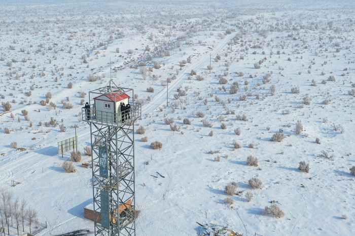 1 月22 日,吉木萨尔县国家公益林三叉路口管护站,巡查人员登上瞭望塔观察野生动物栖息地 丁磊/ 摄