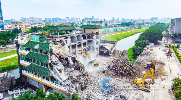 2018年4月18日,霸占龙岗河(新生段)左岸河面多年的“水上龙宫”五层违建被执法部门拆除 (通讯员 许能裕 摄)