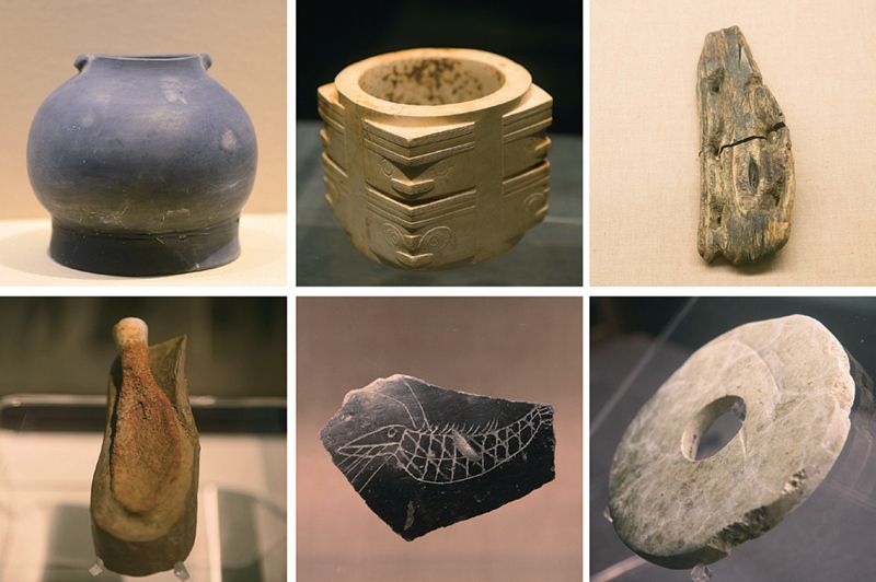 良渚文化遗址出土的黑陶器、玉琮、木屐(上排左起),漆器、陶片、玉璧(下排左起)。(新华社记者 翁忻旸/摄)