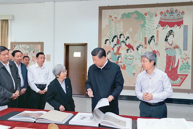 2019年8月19日,习近平总书记在敦煌研究院察看珍藏文物和学术成果展示,了解文物保护和研究、弘扬优秀历史文化情况。(新华社记者 鞠鹏/摄)