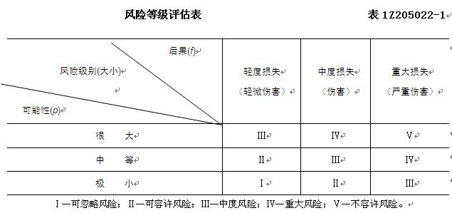 根据对危险源的识别,评估危险源造成的风险可能性和大小,对风险进行分级。GB/T28002推荐的简单的风险等级评估如表1Z205022-1所示,结果分为Ⅰ、Ⅱ、Ⅲ、Ⅳ、Ⅴ五个风险等级。通过评估,可对不同等级的风险采取相应的风险控制措施。