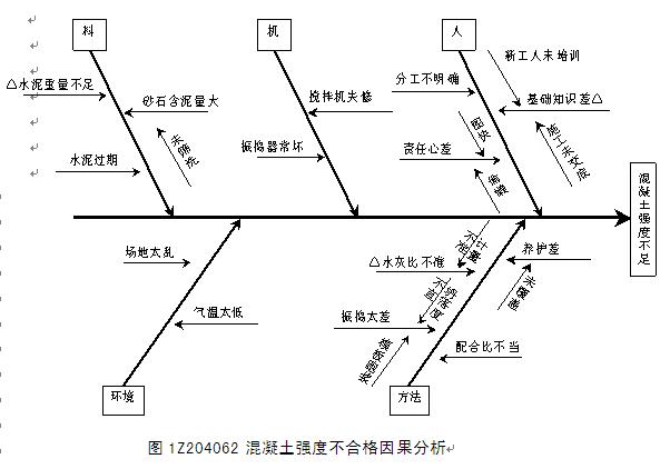 因果分析图法,也称为质量特性要因分析法,其基本原理是对每一个质量特性或问题,采用如图1Z204062所示的方法,逐层深入排查可能原因,然后确定其中最主要原因,进行有的放矢的处置和管理。