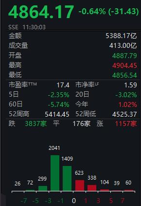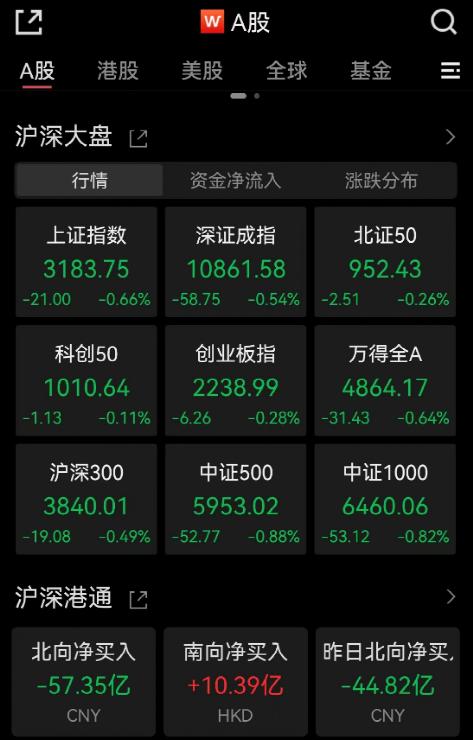 上午北向资金大举流出57.35亿元,其中沪股通净流出27.47亿,深股通29.88亿;超3800只个股飘绿。