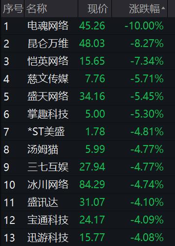 游戏板块午前跳水,电魂网络跌停,昆仑万维跌超8%,恺英网络、慈文传媒、盛天网络、掌趣科技等跌幅均在5%以上。