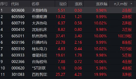 除了日播时尚外,上午连板股颇多。杭州热电拿下10日9板,桂东电力7日5板,睿能科技5连板,台海核电、*ST新联4连板。