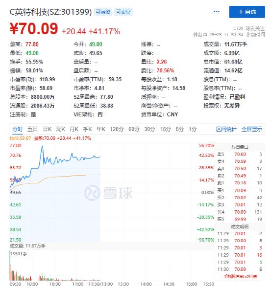 此外,上午创业板次新股整体拉升,C英特科技触及临停。截至上午收盘,C英特科技大涨41.17%。