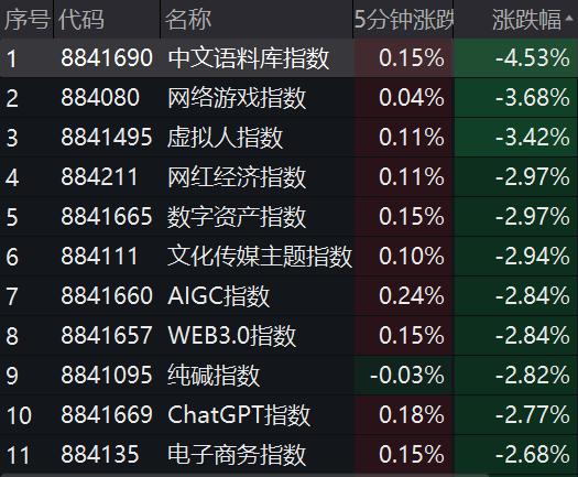 上午传媒板块仍在持续回调当中,中文语料库、网络游戏、虚拟人、网红经济、数字资产、AIGC等概念跌幅居于市场前列。