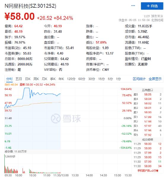 具体来看,同星科技于今日登陆创业板市场,发行价格为31.48元/股,发行市盈率为30.33倍。上午高开27.67%,此后股价一路上行,盘中两度触发临停,股价最高达到64.42元/股。截至午间收盘,N同星科技涨84.24%,涨幅有所收窄。