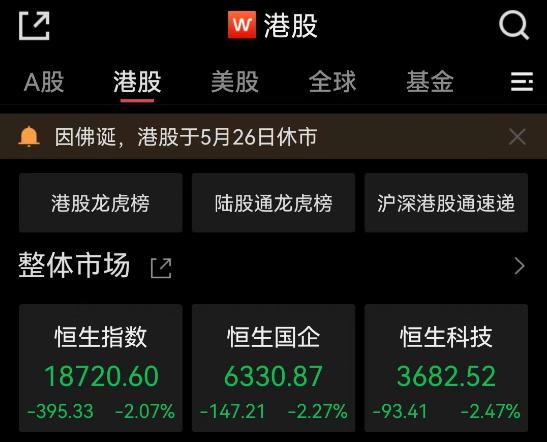港股上午同样低开,盘中持续走弱。截至午间收盘,恒生指数午盘收跌2.06%,报18721.52点,恒生科技指数跌2.47%,恒生国企指数跌2.27%。