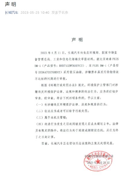 5月25日,长城汽车发布声明称,4月11日,长城汽车向生态环境部、国家市场监督管理总局、工业和信息化部递交举报材料,就比亚迪秦PLUSDM-i、宋PLUSDM-i采用常压油箱,涉嫌整车蒸发污染物排放不达标的问题进行举报。