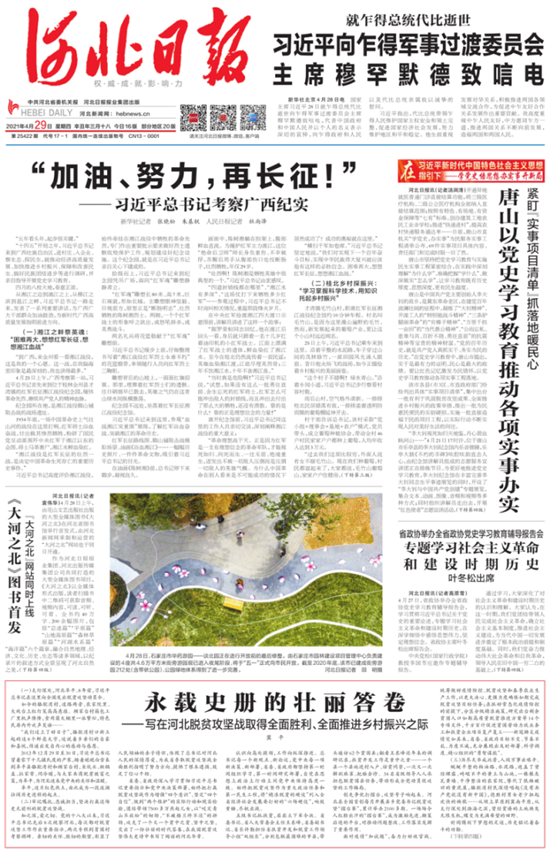 2021年,河北日报社紧紧立足履行好省委机关报职责定位,围绕中心,服务大局,聚焦宣传阐释好习近平新时代中国特色社会主义思想,围绕党和国家重大决策部署和省委、省政府中心工作,以庆祝建党百年重大主题宣传为主线,推出了一大批有思想、有温度、有品质的作品,深入解读国家政策,加强舆论引导,开展建设性舆论监督,积极开展对外传播,全方位讲好河北故事。