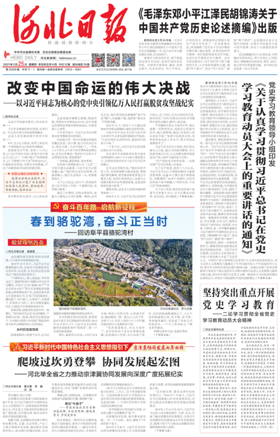 全力做好庆祝建党100周年、党史学习教育宣传报道。全媒体平台同步推出“奋斗百年路 启航新征程”“在习近平新时代中国特色社会主义思想指引下——学党史 悟思想 办实事 开新局”等十余个专栏专题专区,推出多组系列报道,全面回顾党的光辉历史、讴歌党的丰功伟绩。7月1日-2日推出《燕赵丰碑》《建党百年盛典》等大型特刊,全面反映百年大党的光辉历程和丰功伟绩;采写推出《学史力行践初心 为民办事谋福祉》等长篇综述和《“数”记河北奋进足迹》等系列报道;策划推出系列微纪录片《红色档案印初心》《红色“冀”忆》、系列融媒体报道《循着家书访家乡》、大型专题报道“新青年对话老党员”等产品,在全媒体平台广泛传播。