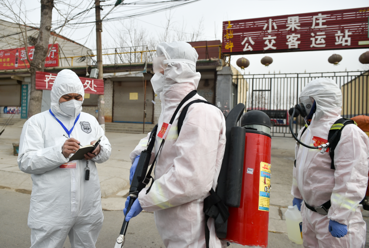 河北日报社记者董昌(左一)在藁城小果庄村疫情防控一线采访