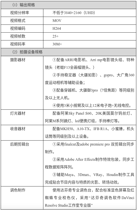 3.制作指标要求:前期素材和成品技术参数应达到数字高清标准或高于此技术指标。后期制作使用苹果finlcut编辑软件 。调色使用达芬奇软件。特技使用3D max特效EC合成技术。音乐为作曲家定制音乐或版权音乐。