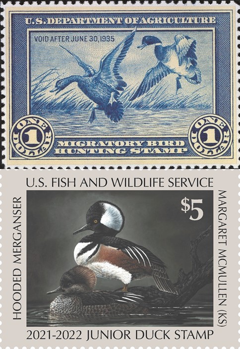 1935年第一版联邦鸭票和2021年的联邦青少年鸭票。图片来源:U.S. Fish & Wildlife Service