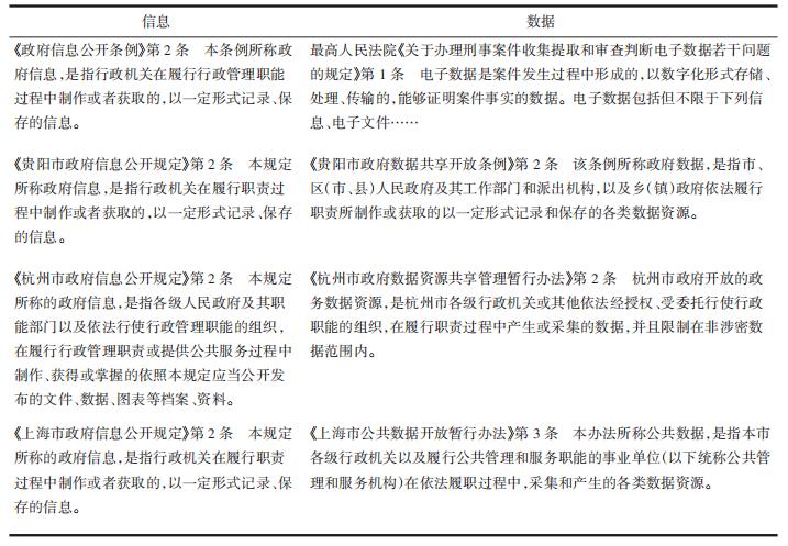 尽管学界较为一致地认为“信息”和“数据”两者是有着明显区别的,但是在中央和地方立法中却往往存在混用的现象。表1以国务院、最高人民法院、贵阳、杭州、上海为例,列举了在信息公开和数据开放方面不同的法律文件规定。