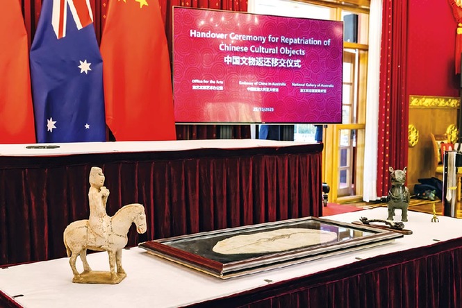 2023年10月25日,在澳大利亚首都堪培拉,中国驻澳大利亚大使馆展示澳返还的流失文物与化石