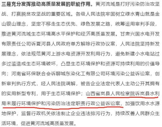 2020年,全省法院审结环境资源案件5484件,其中刑事案件769件、民事案件4464件(包括环境公益诉讼案件24件)、行政案件251件,依法惩治破坏生态环境违法犯罪,发挥生态环境民事审判救济和修复功能,监督行政执法机关依法履职。岚县水利局不履行拆除排水口法定职责行政公益诉讼案被最高法院评为十大“黄河流域生态环境司法保护典型案例”之一。