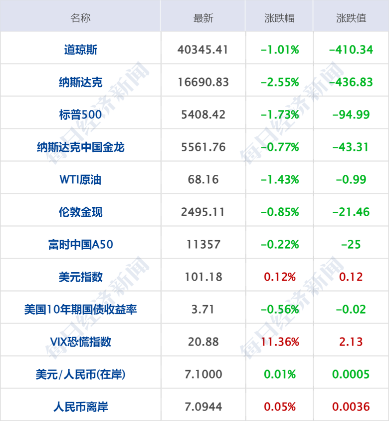 美股三大指数集体收跌,纳指跌436.83点,跌幅2.55%,本周累跌5.77%,周线两连跌,创2022年1月以来最大单周跌幅;标普500指数跌1.73%,本周累跌4.25%;道指跌410.34点,跌幅1.01%,本周累跌2.93%,标普500指数、道指均创2023年3月以来最大单周跌幅,并终结周线三连涨;费城半导体指数跌4.52%,本周累跌12.22%,创2020年以来最大单周跌幅。大型科技股普跌,特斯拉跌超8%,谷歌、英伟达跌逾4%,亚马逊、Meta跌超3%,奈飞、英特尔跌超2%,微软跌逾1%,苹果小幅下跌;博通跌超10%,创2020年3月份以来最差单日表现。中概股多数下跌,纳斯达克中国金龙指数跌0.77%,本周累计下跌0.83%。小鹏汽车跌超3%,爱奇艺、理想汽车、富途控股、百度跌超2%,哔哩哔哩、阿里巴巴、微博、京东、腾讯音乐跌超1%,网易小幅下跌,蔚来涨超3%,满帮涨超1%,唯品会、拼多多小幅上涨。