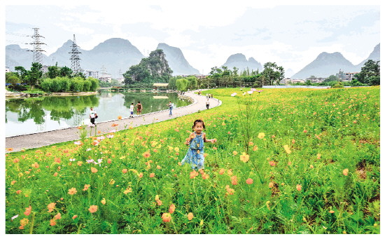 ▲桂林市两江四湖二期工程是一项涵盖生态环境治理、城市景观改造、旅游业态开发、文化内涵挖掘的系统工程,沿线环境改造提升凸显成效,水清天碧,大片盛开的格桑花引来市民到此观赏、游览、休闲。 通讯员王战飞 摄