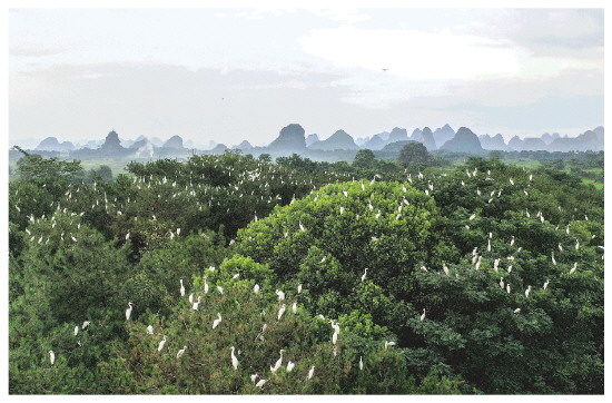 ▲桂林市坚持经济发展与生态保护相结合,积极践行“绿水青山就是金山银山”理念,统筹山水林田湖草沙系统治理,生态环境持续改善。图为在临桂区四塘镇王家村,成群的鹭鸟来此筑巢繁衍,成为乡间的一道风景。   (资料图片)