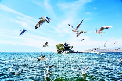 (随着洱海生态向好,每年11月到第二年3月,来自西伯利亚的红嘴鸥成群结队到洱海过冬。杨继培摄/光明图片)