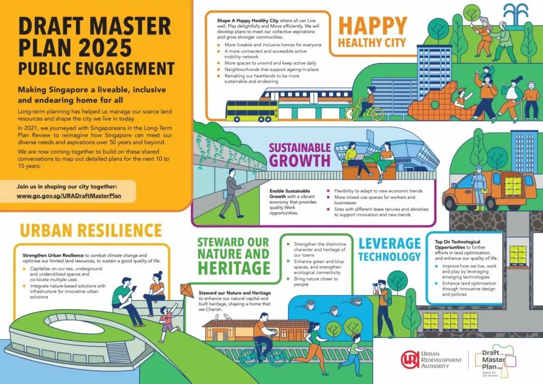 2025年的总体规划草案以 “将新加坡打造成一个宜居、包容且令人热爱的家园” 为愿景,围绕四个主题开展公众参与活动——塑造幸福健康城市、实现可持续增长、增强城市复原力以及保护我们的自然和遗产。以下是四个主题的详细介绍: