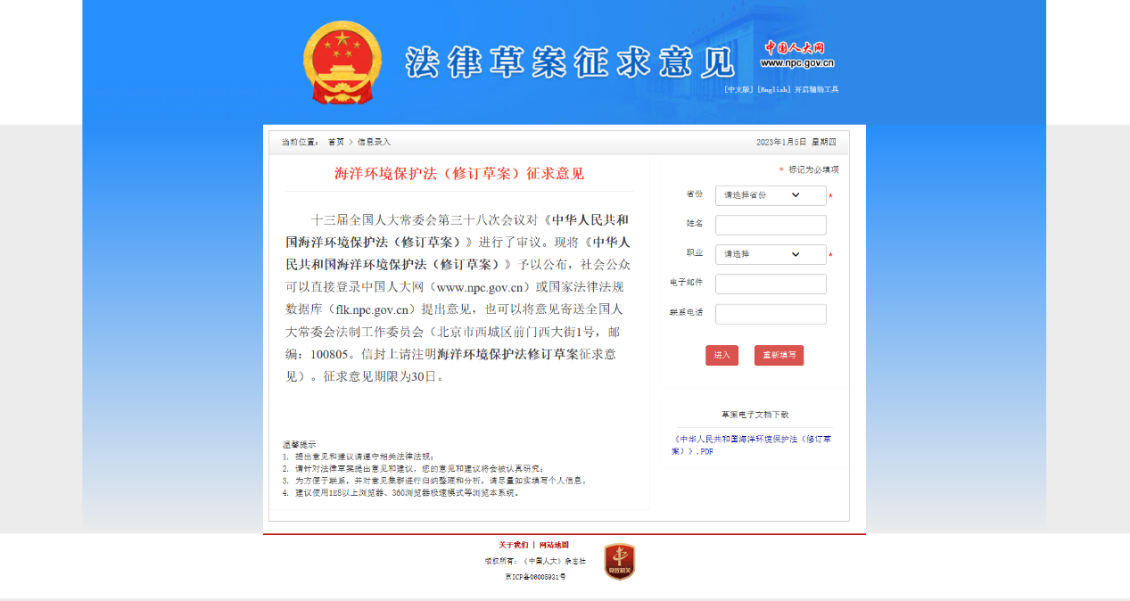 为保护和改善海洋环境,珍惜海洋资源,防治污染损害,维护海洋生物多样性和生态平衡。中国生物多样性保护与绿色发展基金会法律工作委员会将组织研究讨论《修订草案》,欢迎社会各界人士提出宝贵意见和建议(截止日期2023年1月20日)。