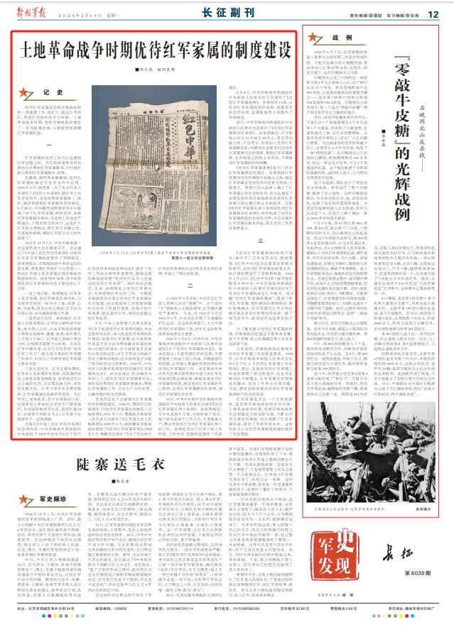 2月8日,中华苏维埃共和国临时中央政府人民委员会正式颁布了《优待红军家属条例》。该条例共13条,从优待红军家属的组织机构、家属享有的优待权利、监督机制等方面都作了详细规定。