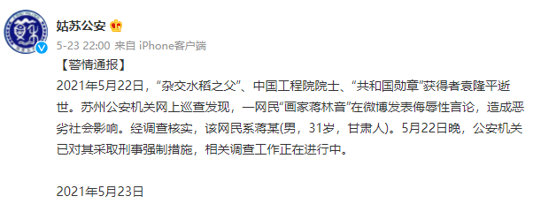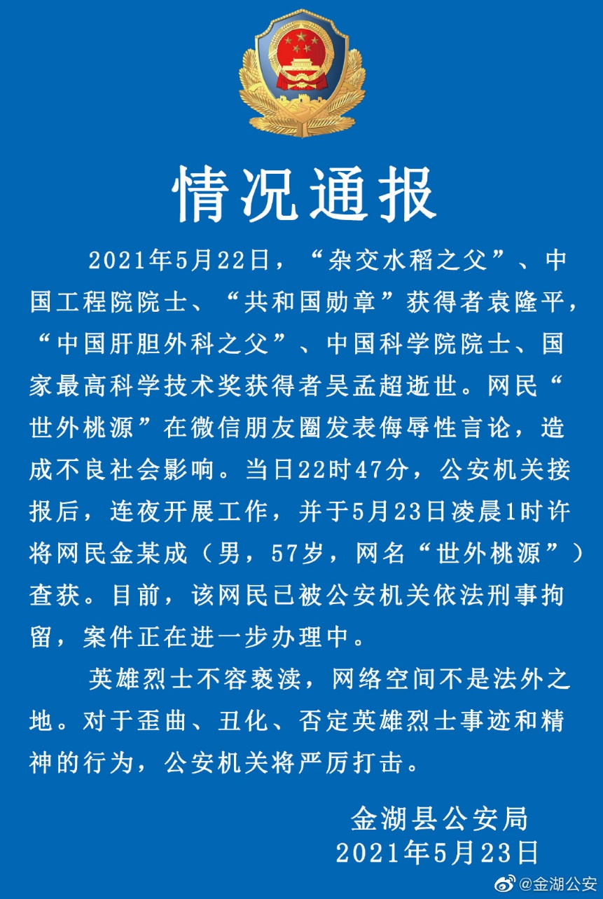 5月23日,因网民“世外桃源”对袁隆平、吴孟超两位院士逝世发表侮辱性言论,江苏金湖警方对其采取刑事强制措施。